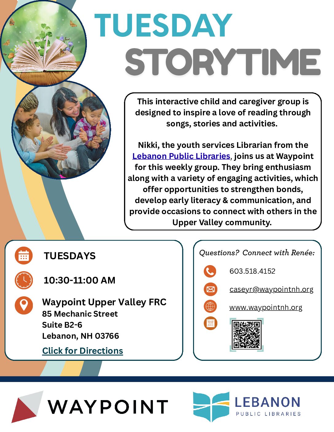 This interactive child and caregiver group is designed to inspire a love of reading through songs, stories and activities. Nikki, the youth services Librarian from the Lebanon Public Libraries, joins us at Waypoint for this weekly group. They bring enthusiasm along with a variety of engaging activities, which offer opportunities to strengthen bonds, develop early literacy & communication, and provide occasions to connect with others in the Upper Valley community.